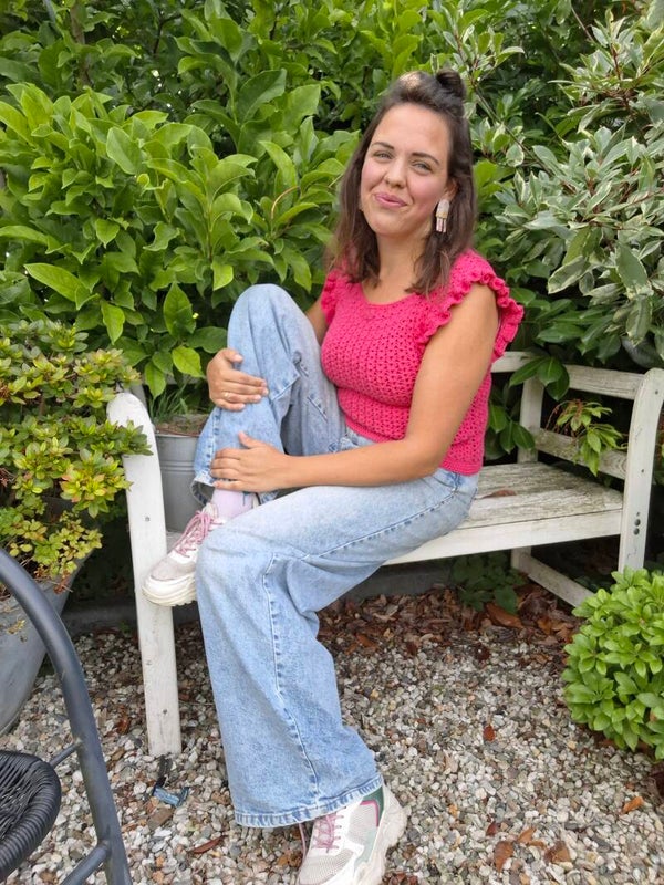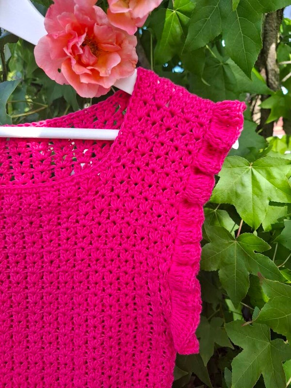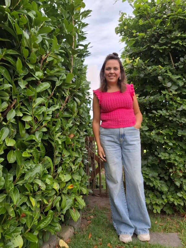 Luchtig, vrouwelijk, kleurrijk en vrolijk. Allemaal woorden die passen bij Vrolijk Haakmeisje, en die je dus ook helemaal terugziet in deze heerlijke zomertop. In het aangesloten model, het luchtig gehaakte motief, het katoenen draadje, en natuurlijk in de kleur. En wat dacht je van het roezelrandje langs de armsgaten? Combineer dit topje op een stoere spijkerbroek, of draag hem juist heerlijk op een luchtige, lange rok.