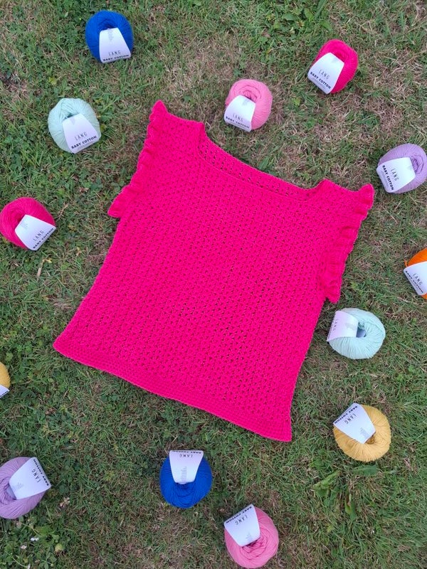 Het patroon is geschreven in maat S/M en maat L/XL. Voor beide maten krijg je 5 bollen Lang Yarns Baby Cotton in een kleur naar keuze.