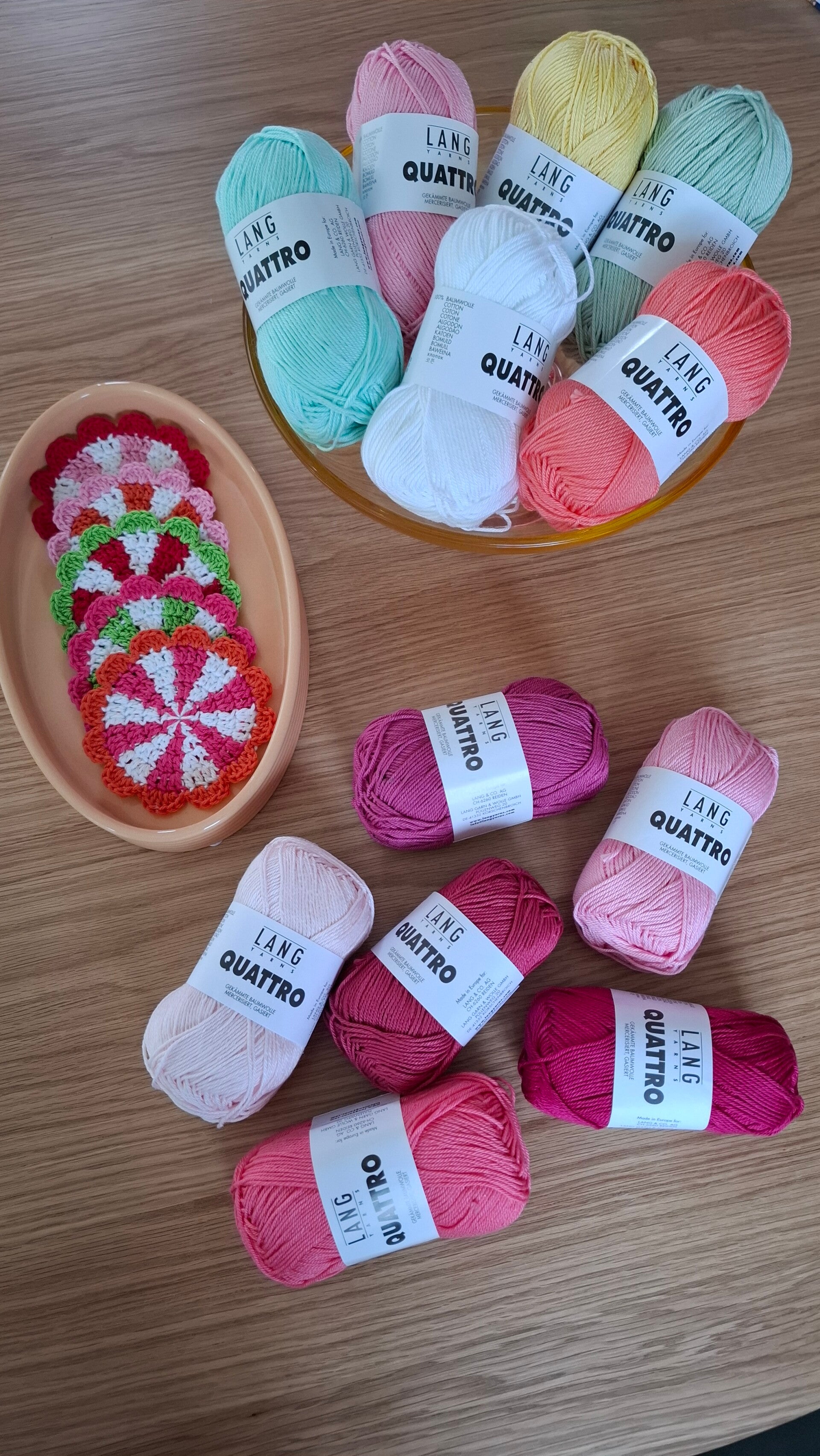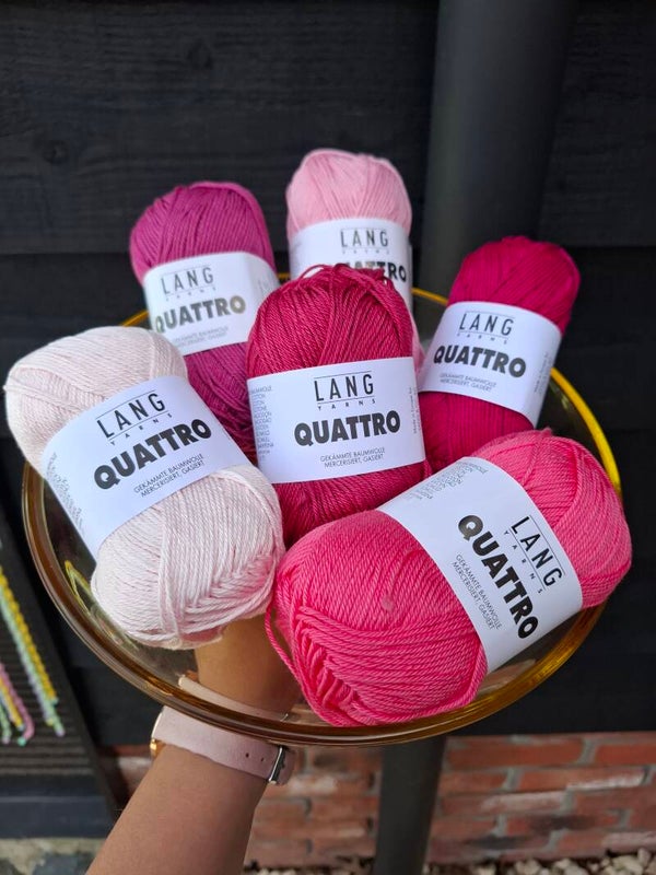 In dit pakket vind je 6 bollen Lang Yarns Quattro om deze leuke onderzetters te haken. Je kunt kiezen voor de getoonde voorbeelden, maar ook je lievelingskleurnummers doorgeven in de opmerkingen. Via deze link kan je bekijken welke kleuren je wilt, het zijn er te veel om screenshots van te maken 😅: https://www.langyarns.com/en/Wool-Yarns/?yarnDetail=16